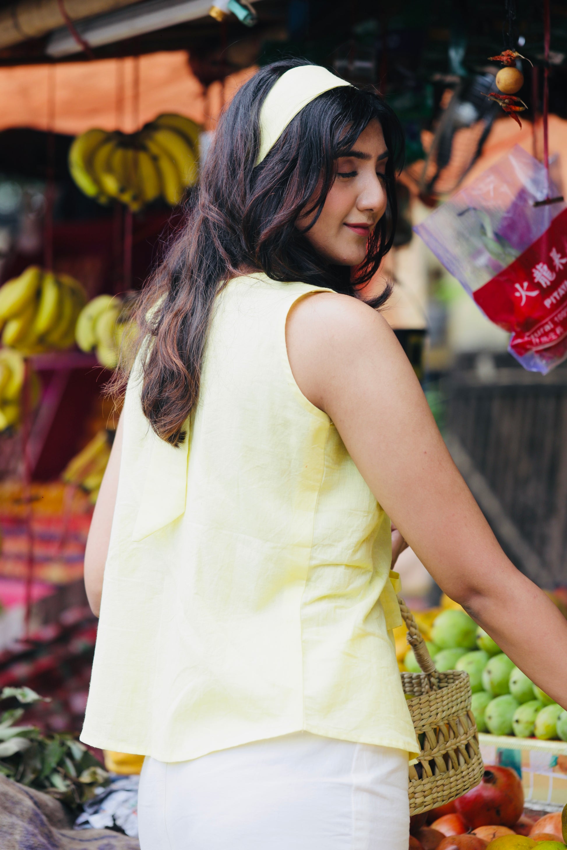 A soft pastel yellow cotton top with sweet bows and pearl accents — playful, fresh, and full of summery charm.