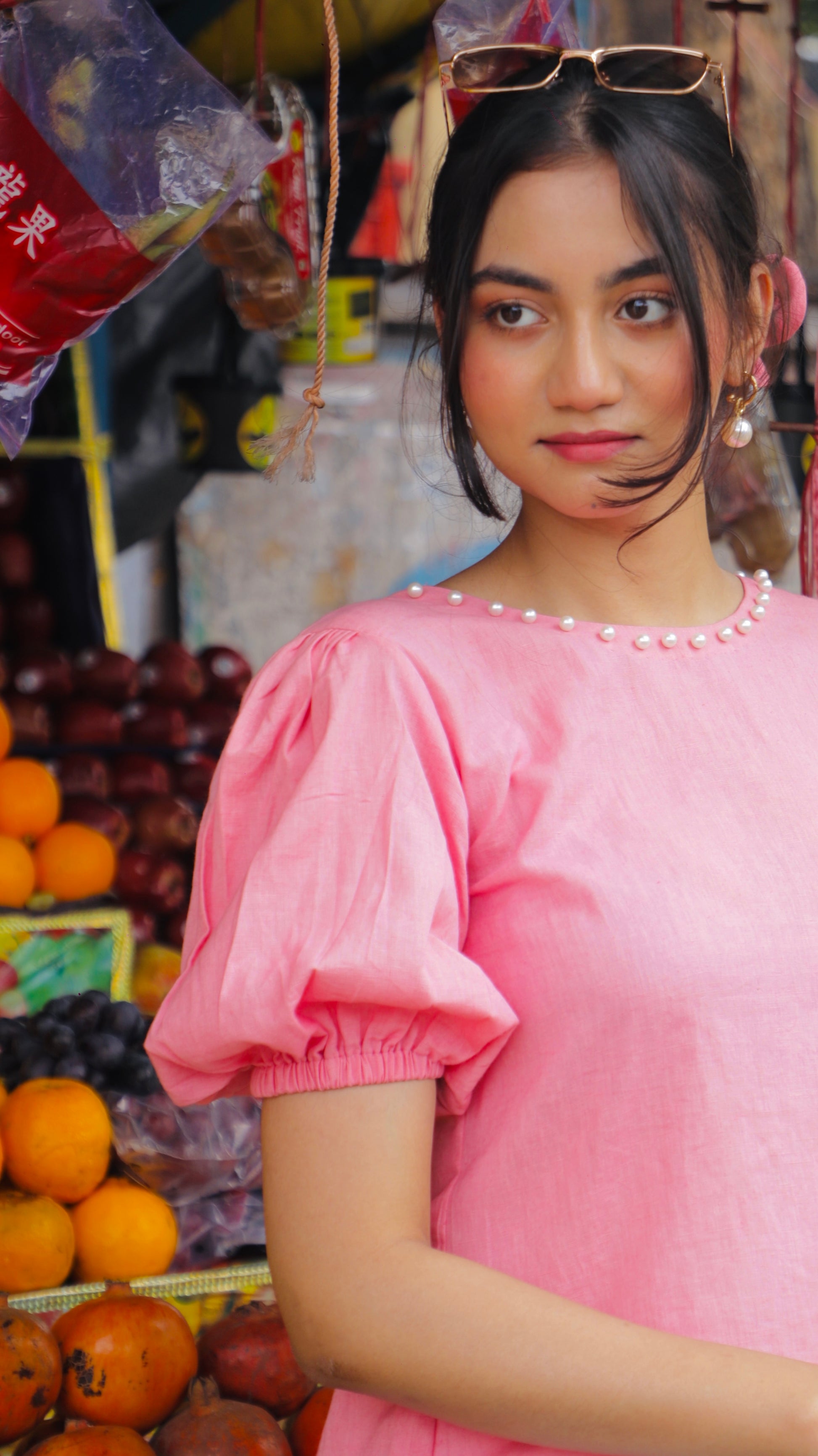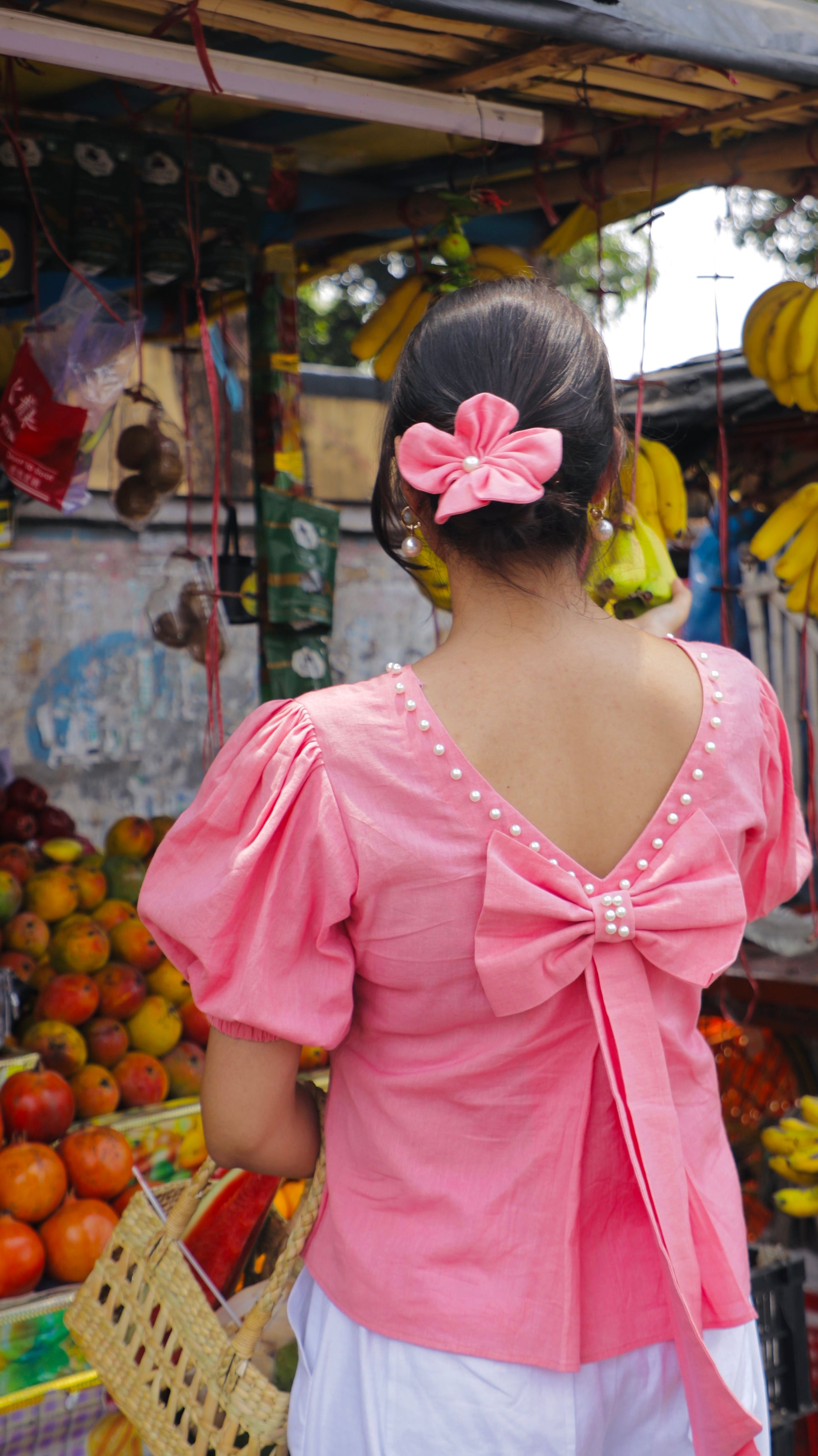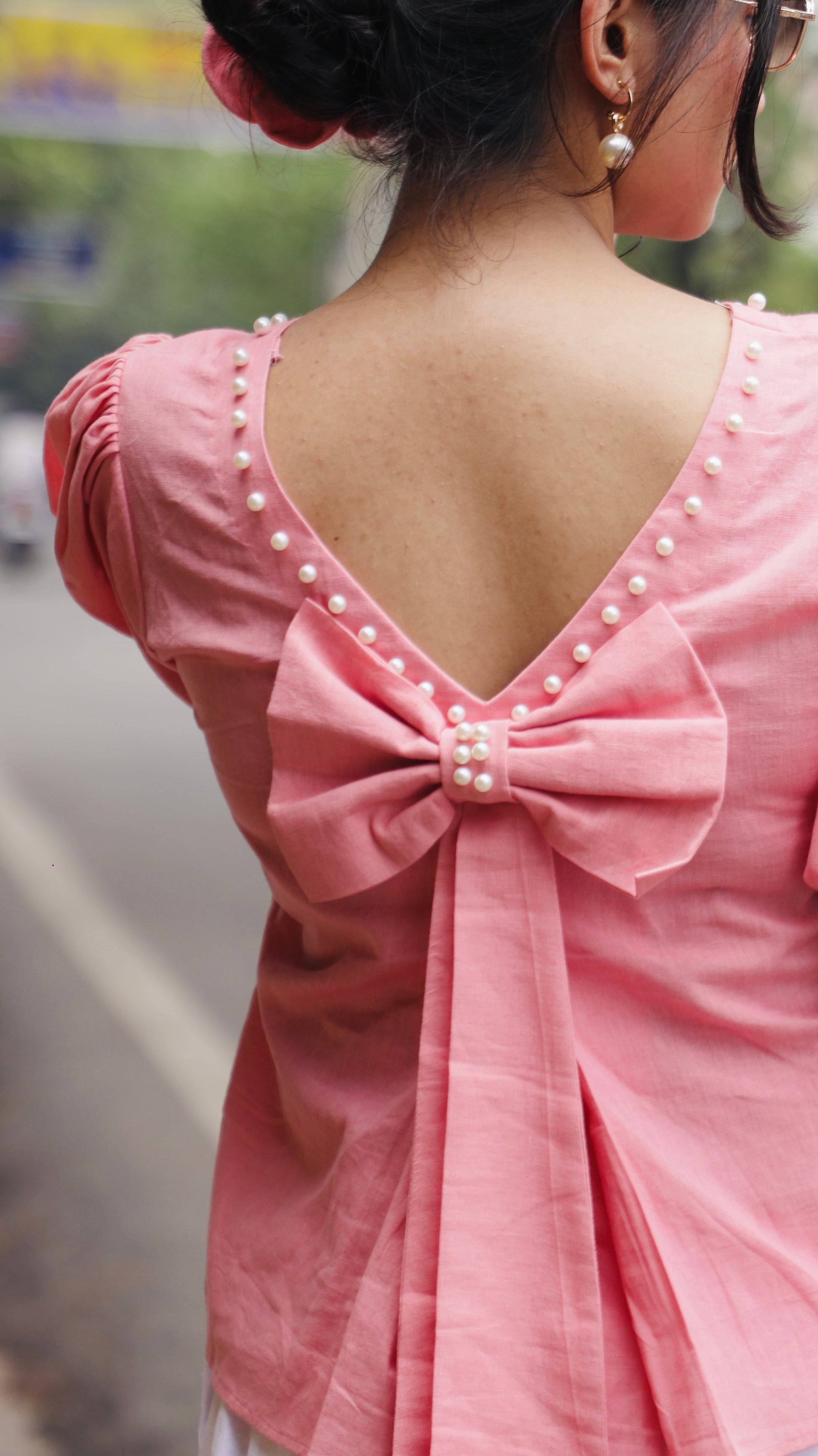In a dreamy pastel pink, this top features delicate neck detailing and a statement back bow with pearl embellishments — gentle, charming, and full of soft drama.