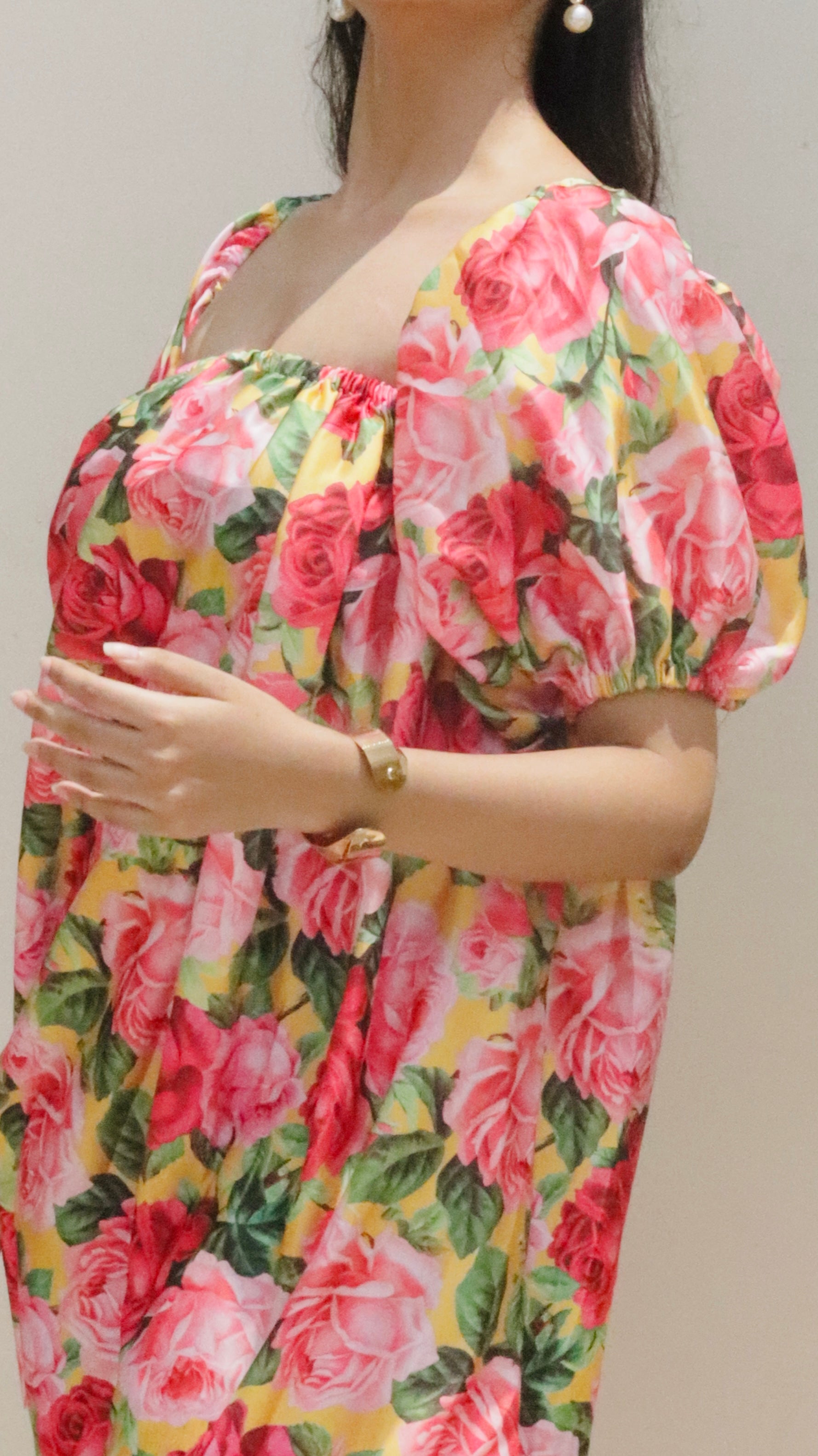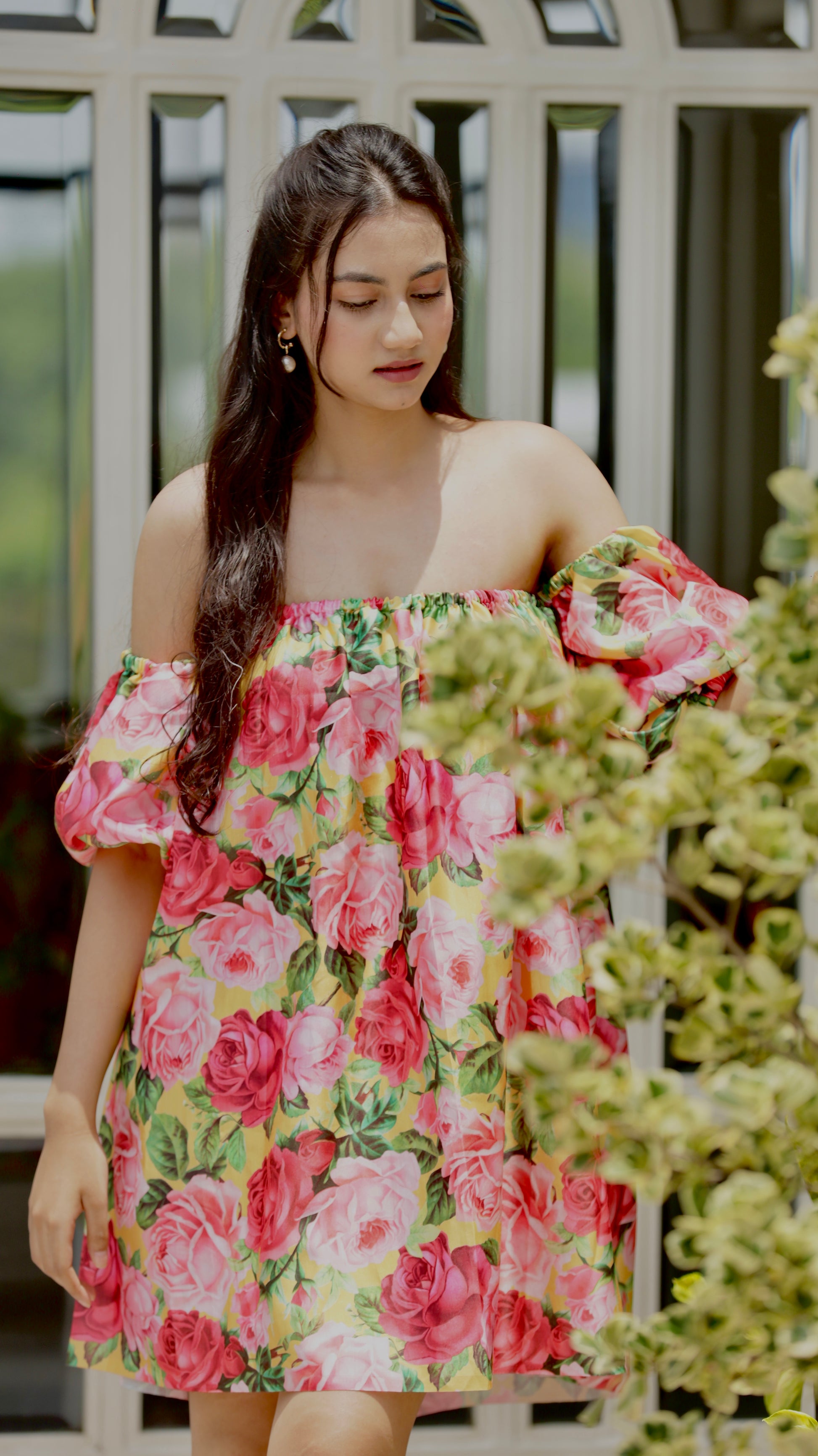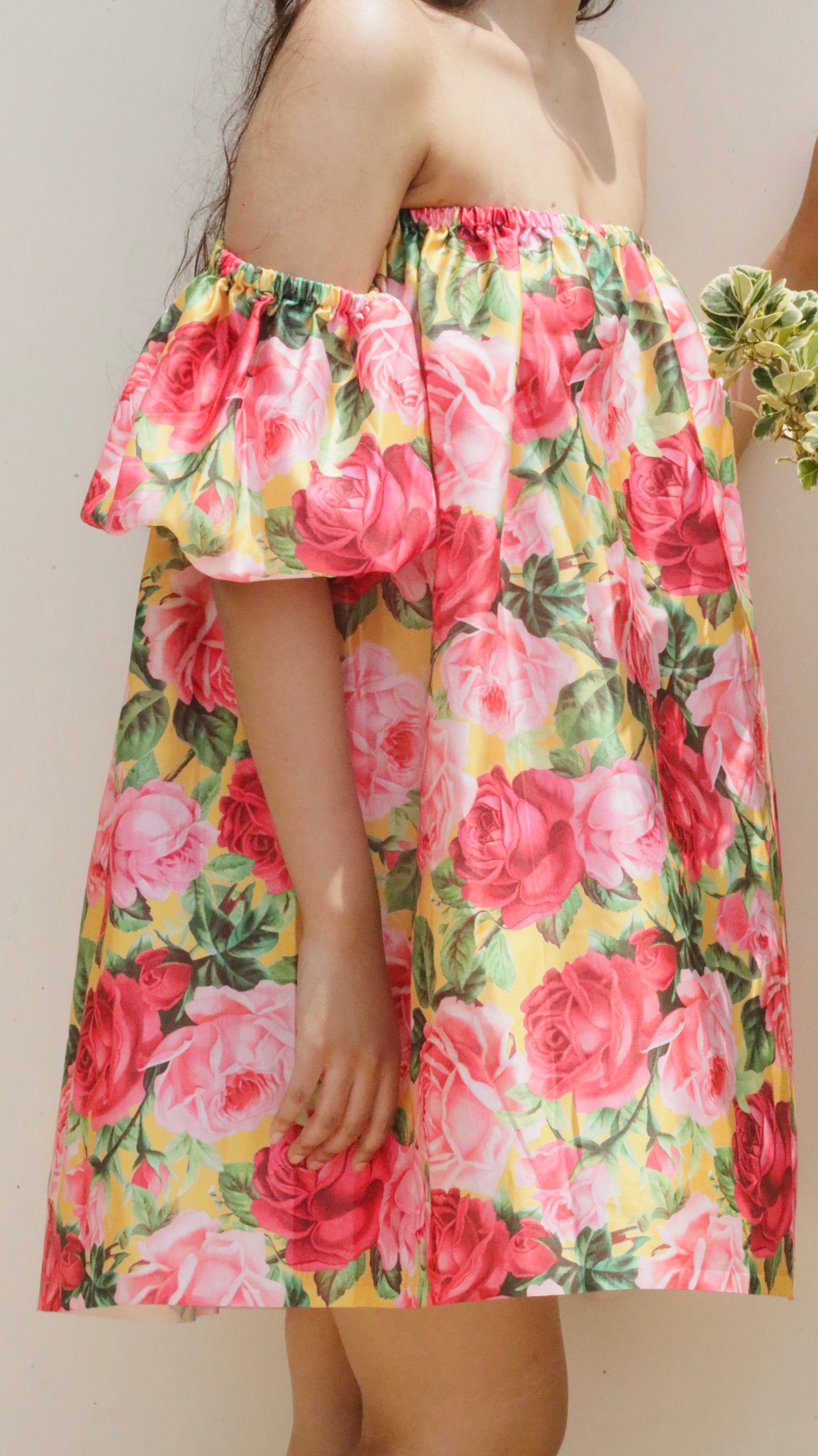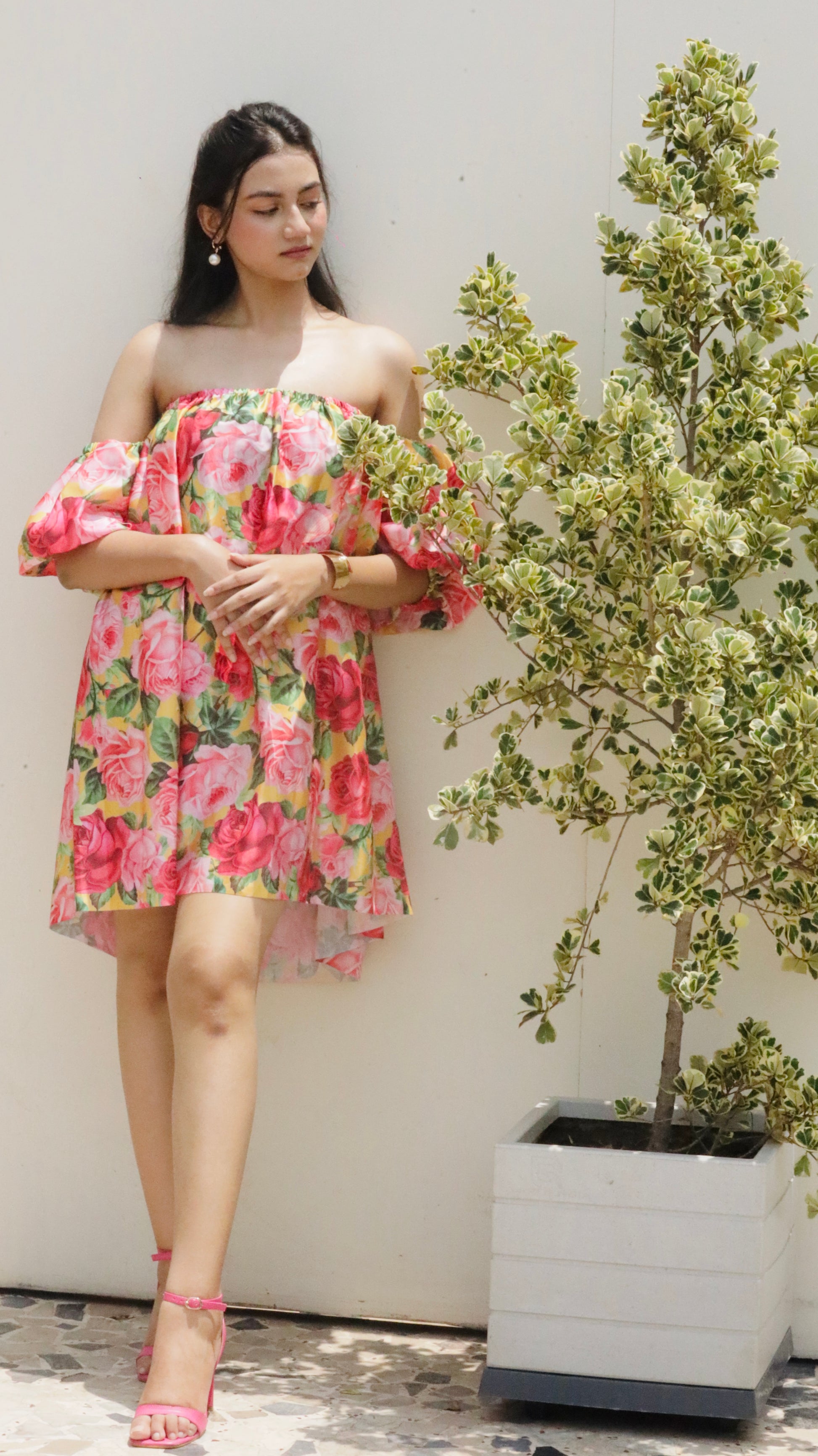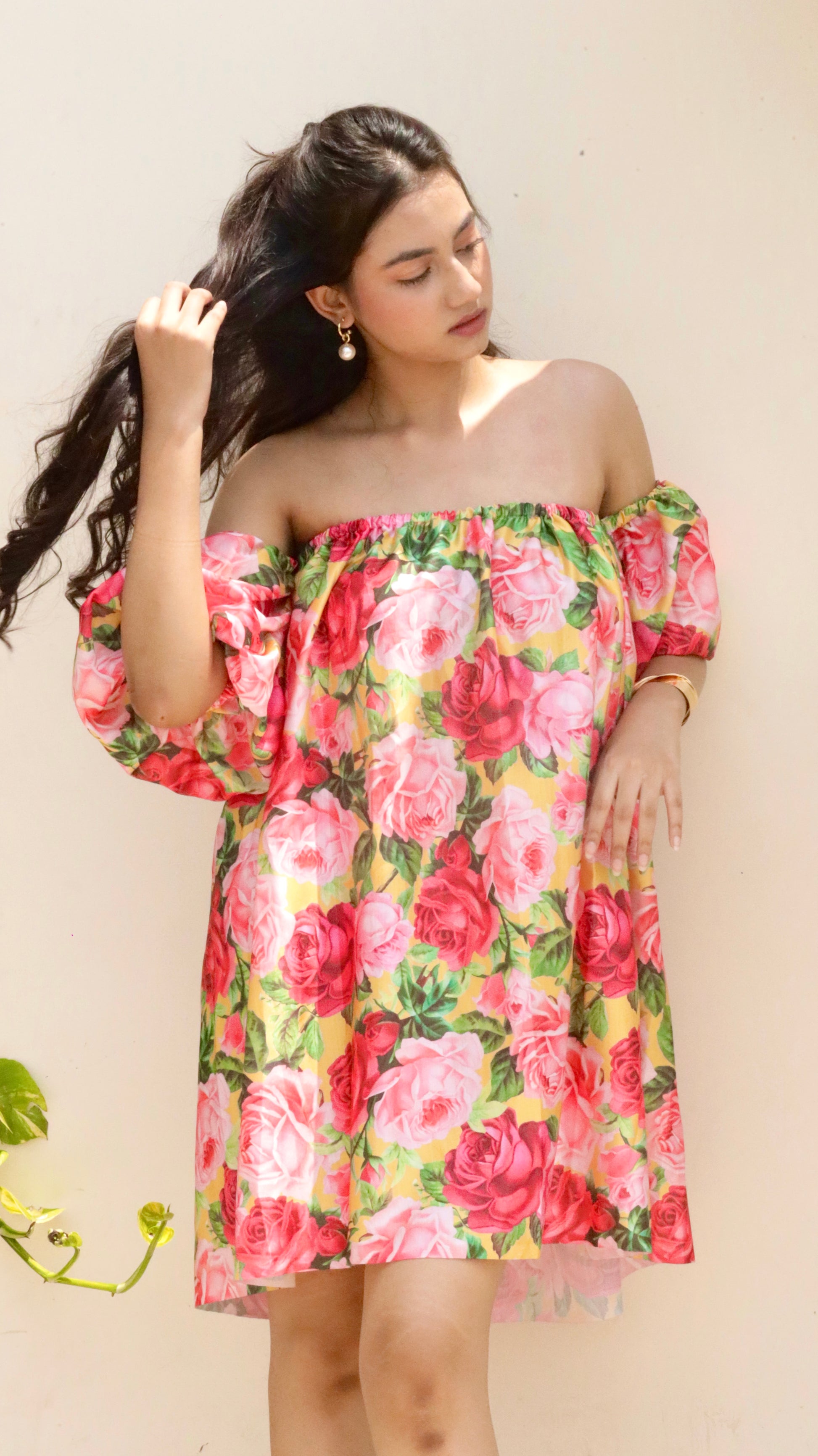 A soft off-shoulder dress with puffy sleeves and bold rose prints — where romance meets colour.